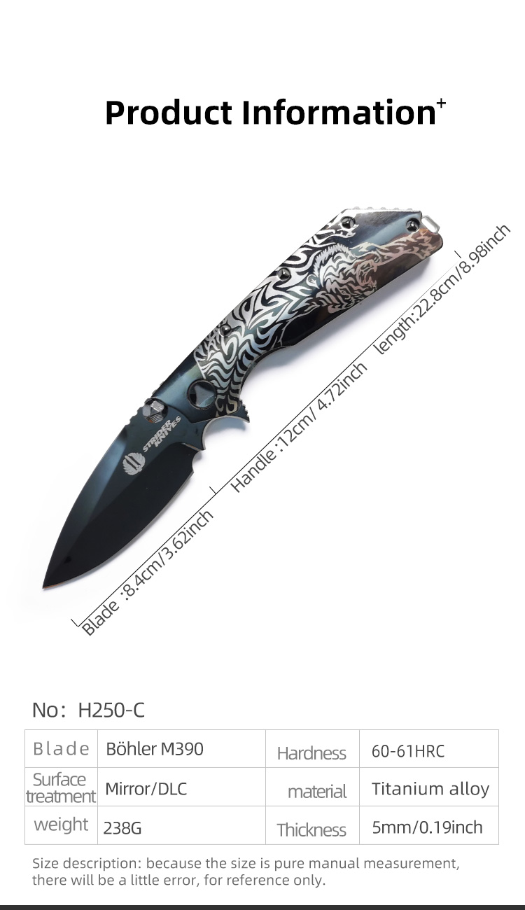 H250-C folding knife Böhler M390 high quality steel Mirror/DLC Diamond-Like Carbon titanium alloy hilt Fruit knives H250-C folding knife Böhler M390 high quality steel Mirror/DLC Diamond-Like Carbon titanium alloy hilt Fruit knives